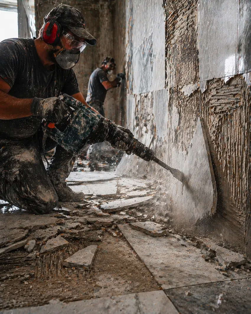 Снятие облицовки и клея с открытием основания под новую отделку. На таких задачах важно не просто отбить плитку, а нормально освободить поверхность под след…